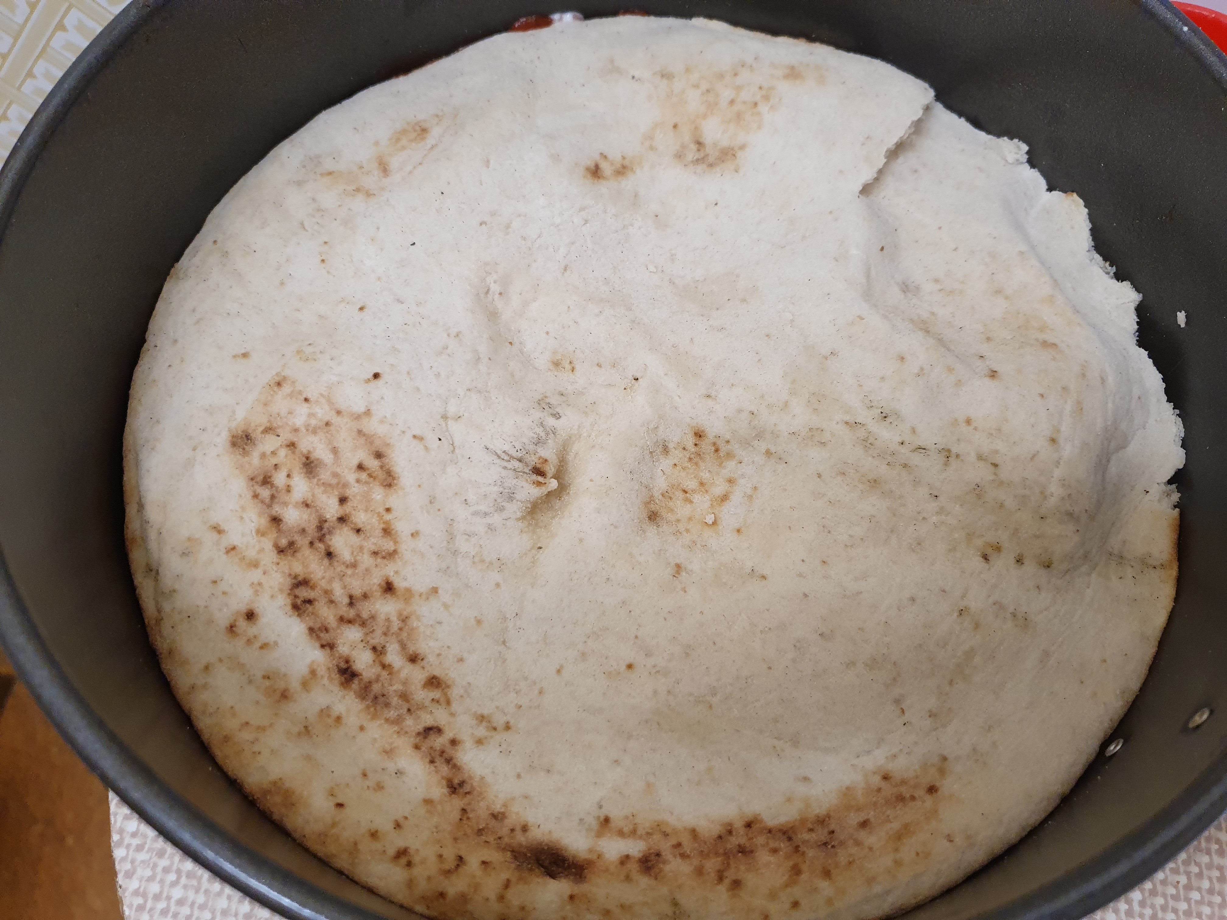 The recipe then calls for a tube of refrigerated pizza dough to be unrolled and laid on top of the cheese. This isn't a product that is readily available in the UK, so instead I opted for a part-baked pizza base (its shape being the reason I went for a round cake tin rather than a casserole dish), sitting it neatly on top, and hoping that it wouldn't affect the outcome of pizza too much.